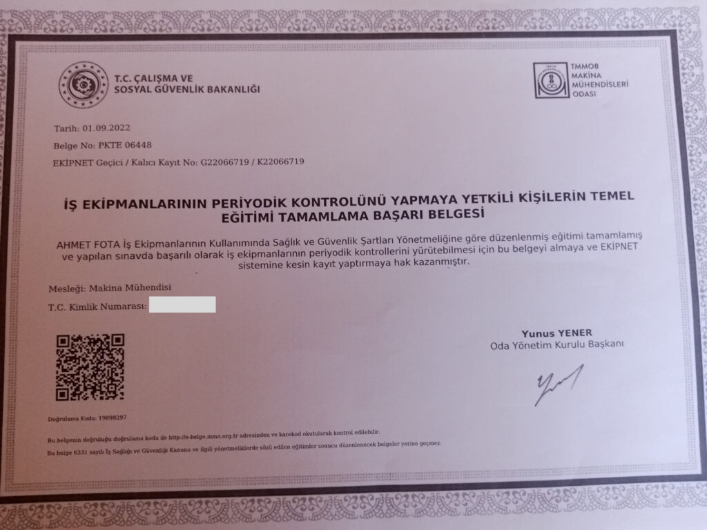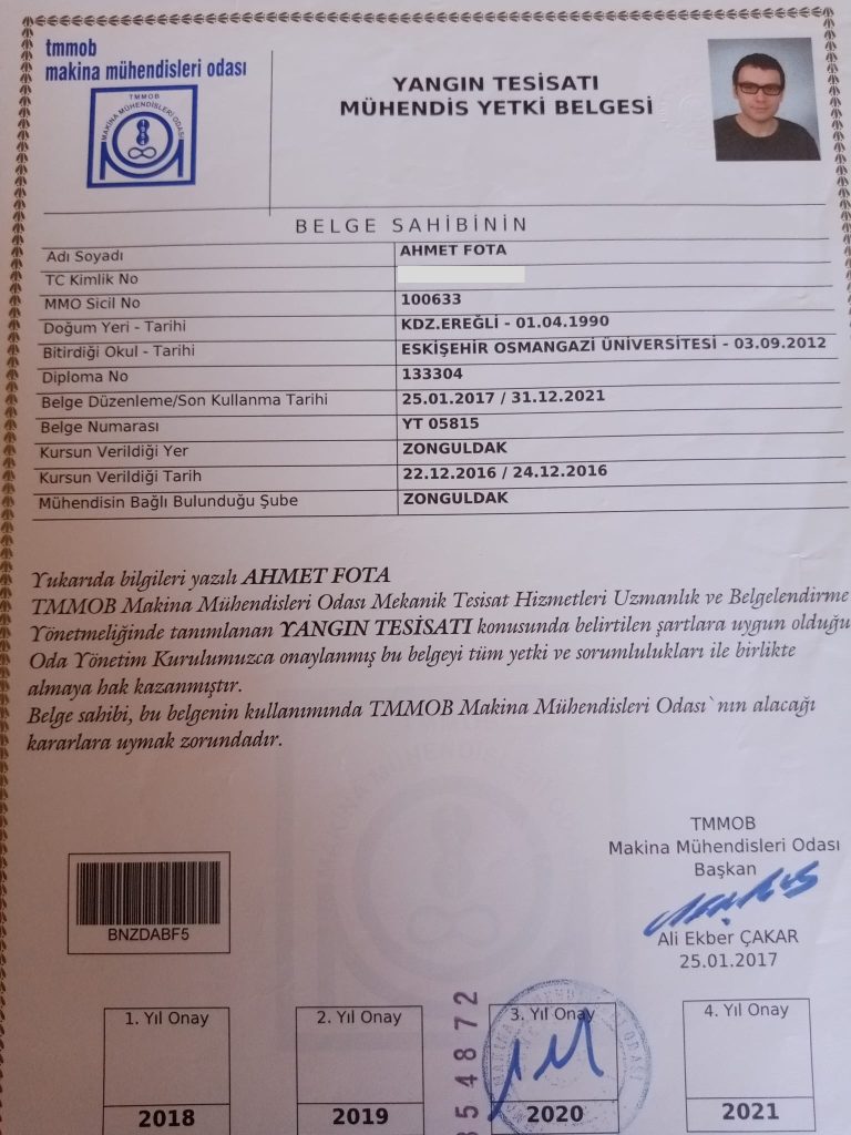 Yangın Tesisatı Mühendis Yetkilendirme Belgesi – MMO